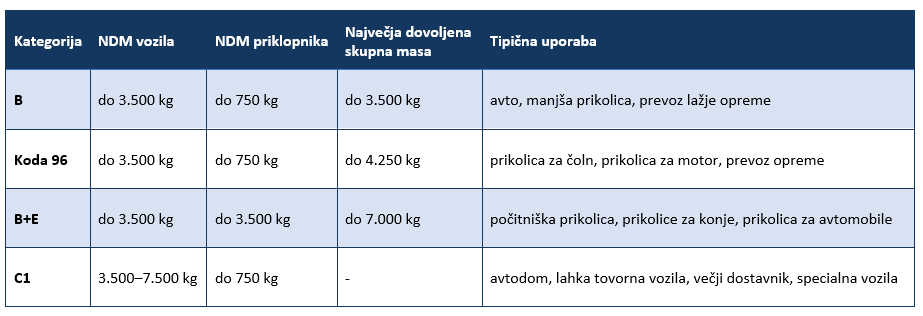 Veliko voznikov se sprašuje, katero vozniško kategorijo potrebujejo za prikolico, avtodom ali težje vozilo. Razlika med kategorijami B, B+E, kodo 96 in C1 je predvsem v največji dovoljeni skupni masi (NDM) vozila in priklopnika.